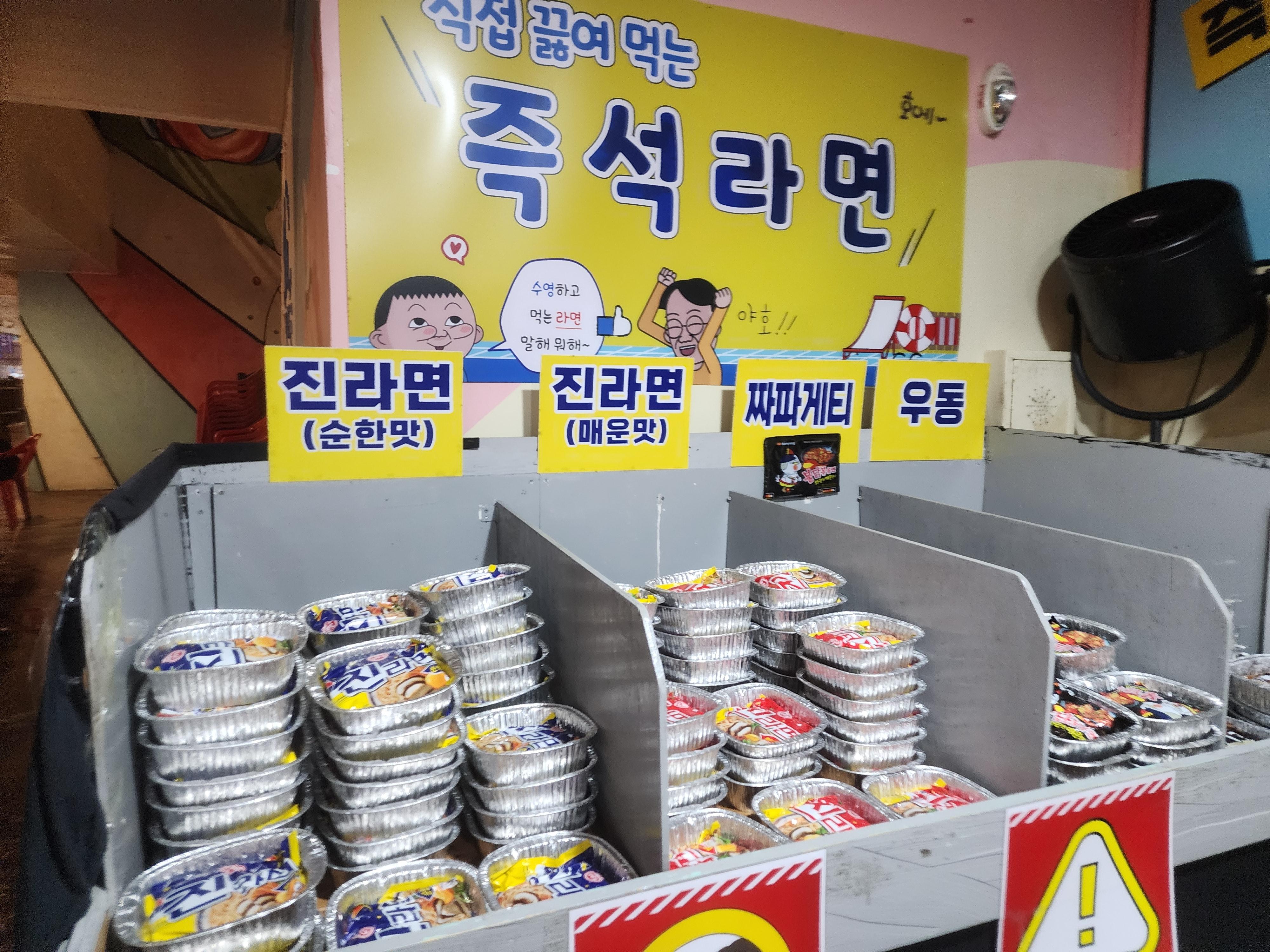 라면으로는 진라면 (순한맛, 매운맛), 짜파게티, 불닭볶음면, 가쓰오 우동이 있었어요! 그리고 옆에는 이 기계 하면 한강만 떠오르는 라면 끓여주는 기계가 있었어요!