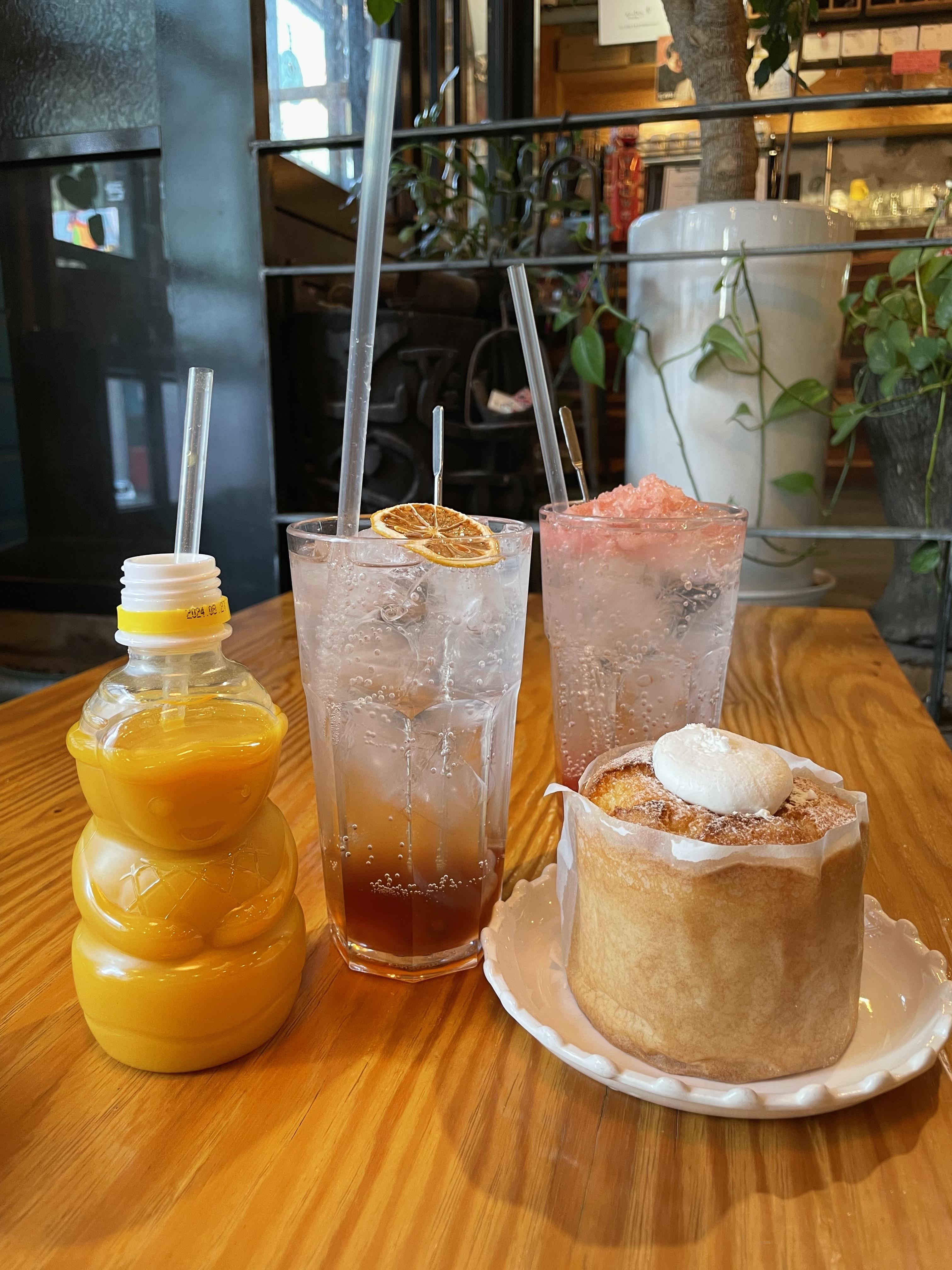 저희는 매실 에이드, 자몽 에이드, 천혜향 음료, 아이가 먹을 빵을 하나 시켜 먹었는데요!
