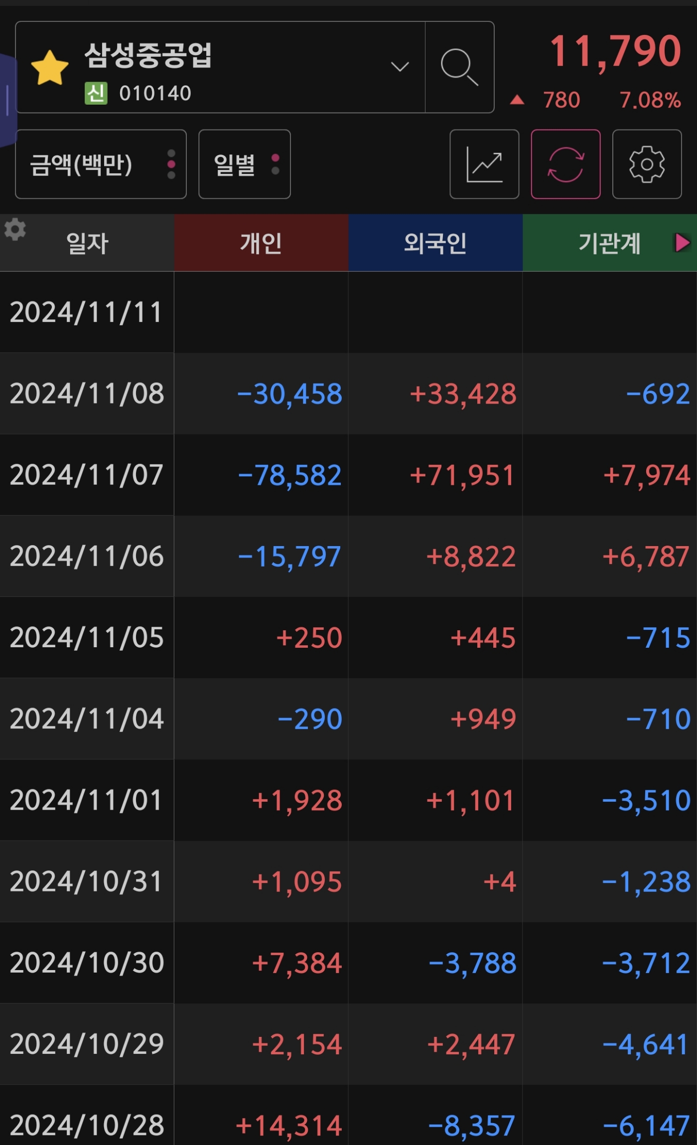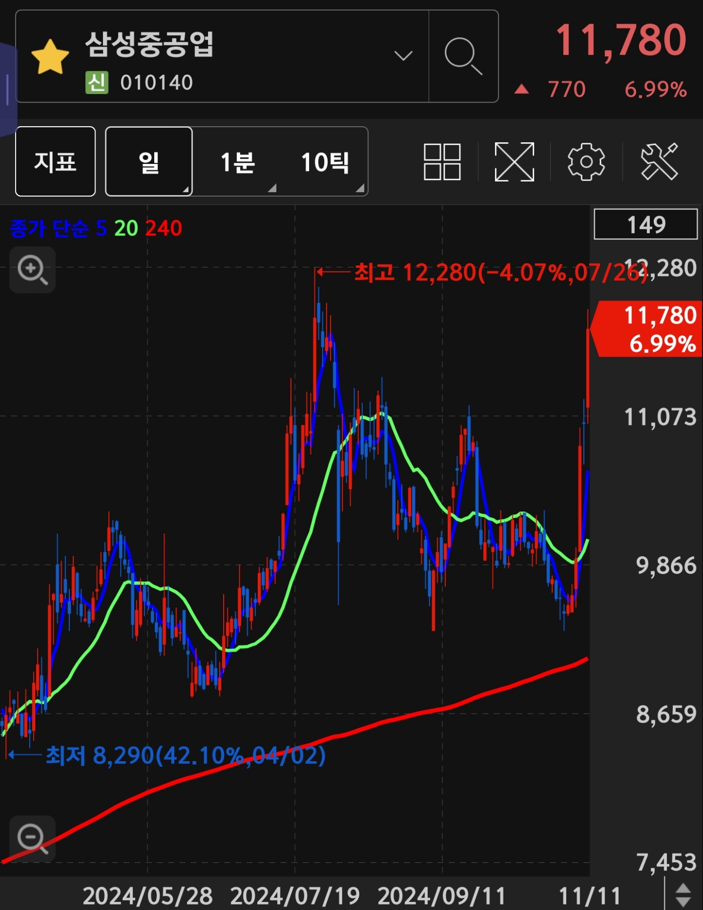 (HD 현대 일렉트릭을 같이 봤고, 윗꼬리가 없는 것을 봤으면 내 생각에 주도주 & 대장주 하나를 가는 게 더 좋은 생각이라고 생각했습니다 HD 현대 일렉트릭은 현재 상승 중입니다...ㅎㅎ)