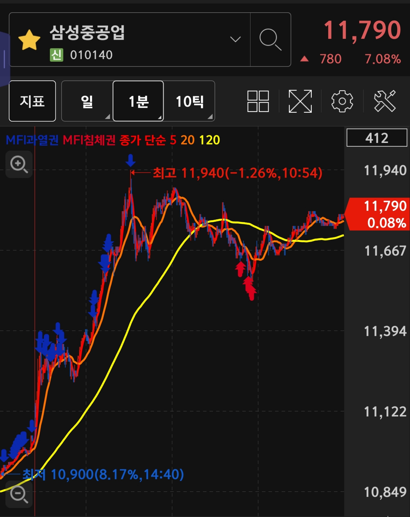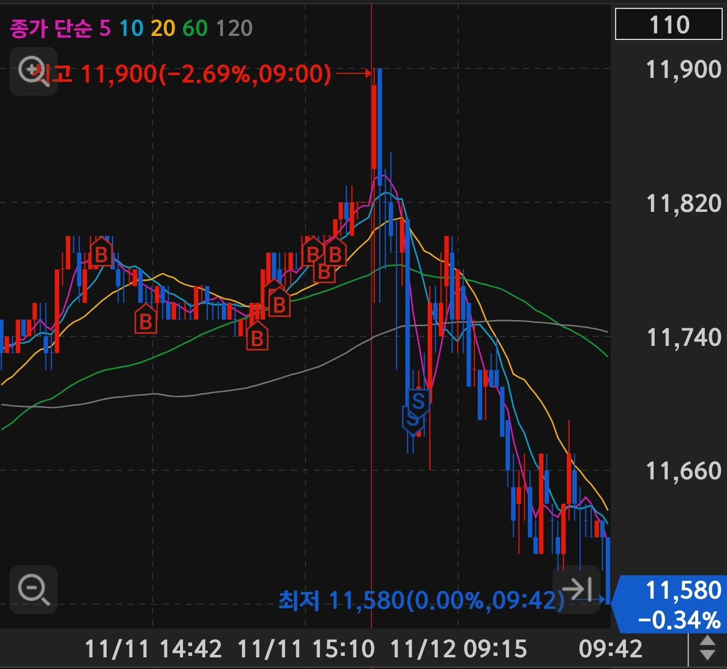 전날은 나름 하락할 때 맞춰서 잘 매수하고 다음날을 기다렸지만 당일날 너무 빠른 상승 후 하락으로...