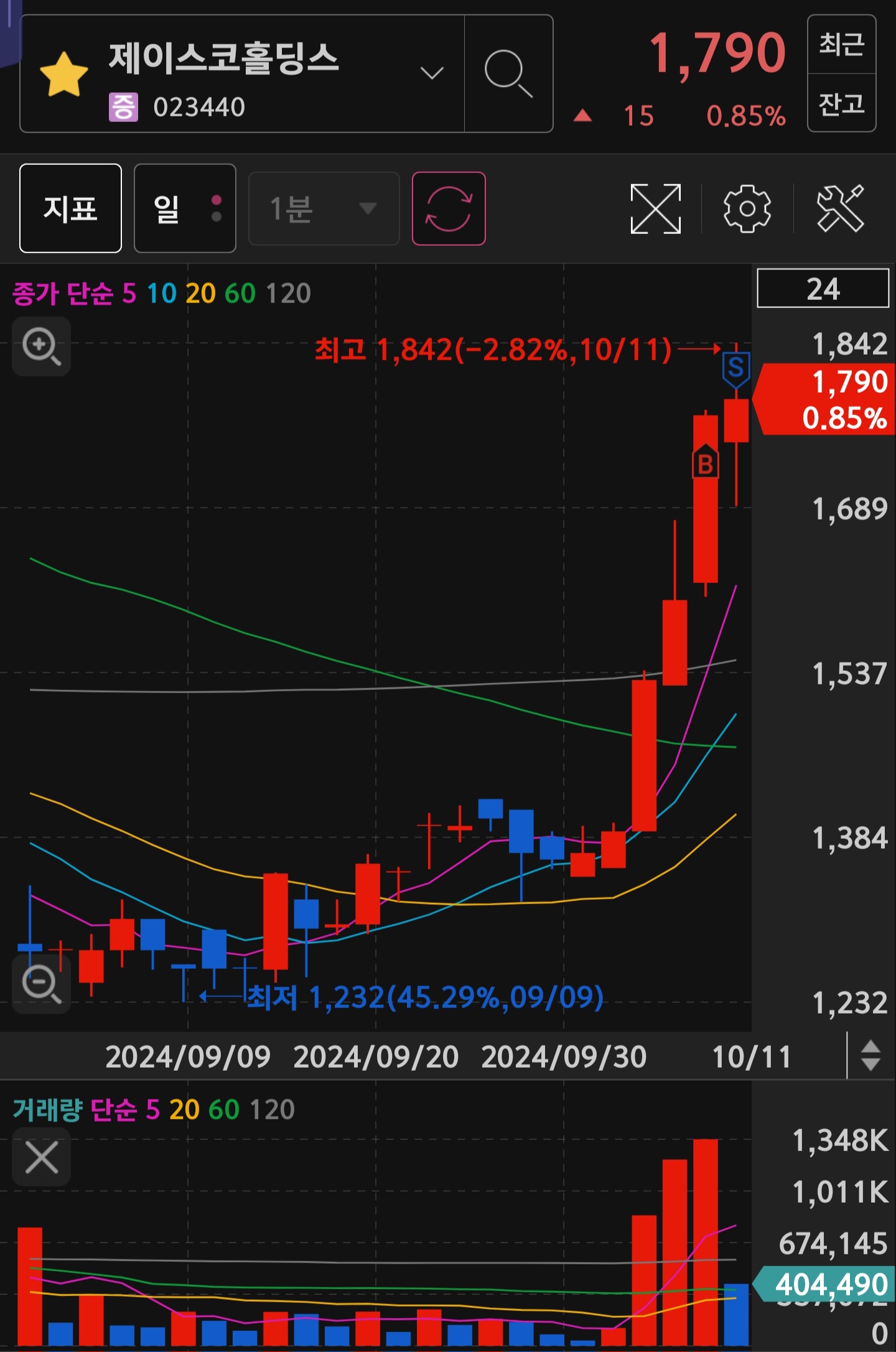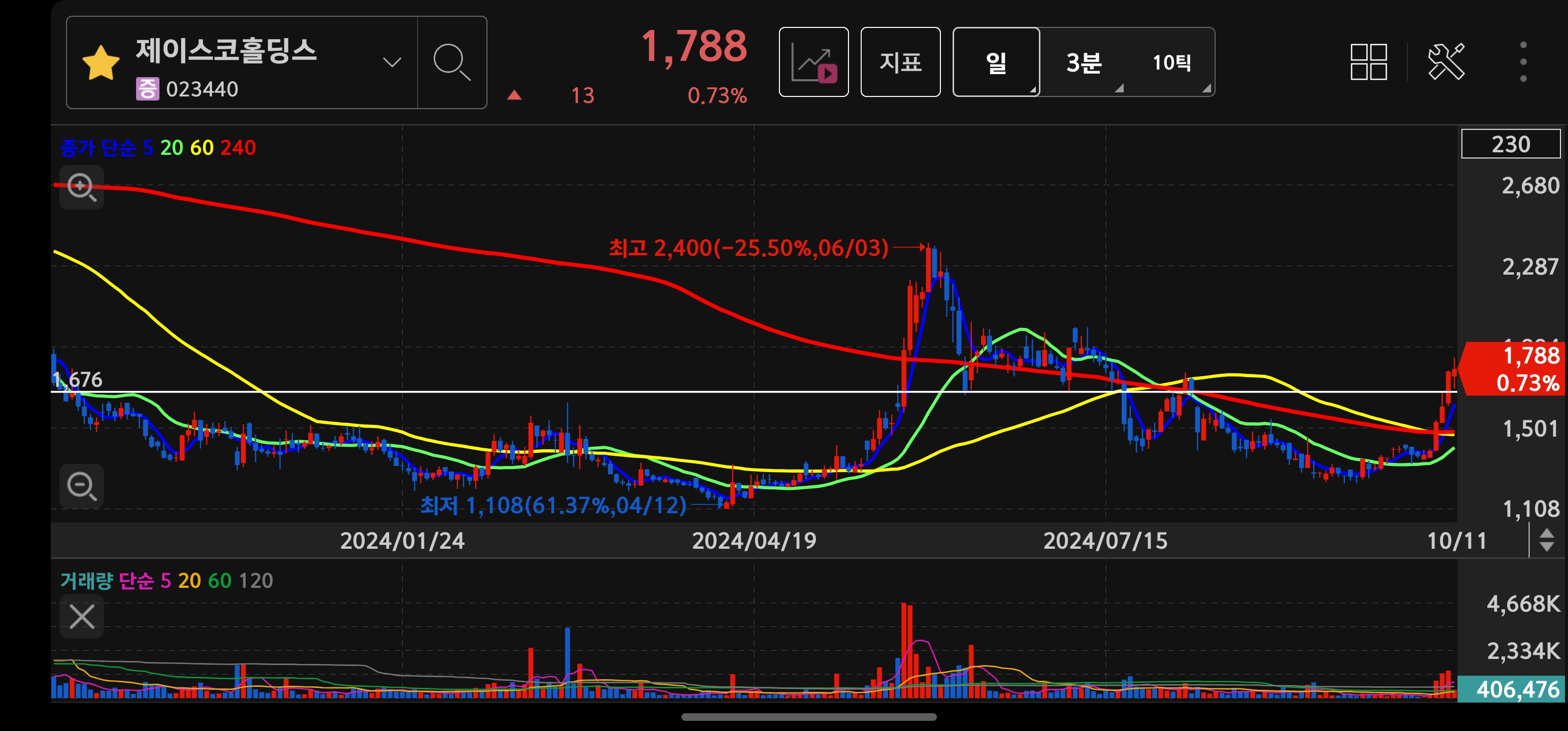 제가 매수한 종목은 제이스코홀딩스인데요! 5일선이 장기 이평선을 돌파하였다는 관점으로 단기 스윙을 생각하며 들어갔습니다! 거래량도 제 기준에서 나쁘지 않다고 생각했고요!