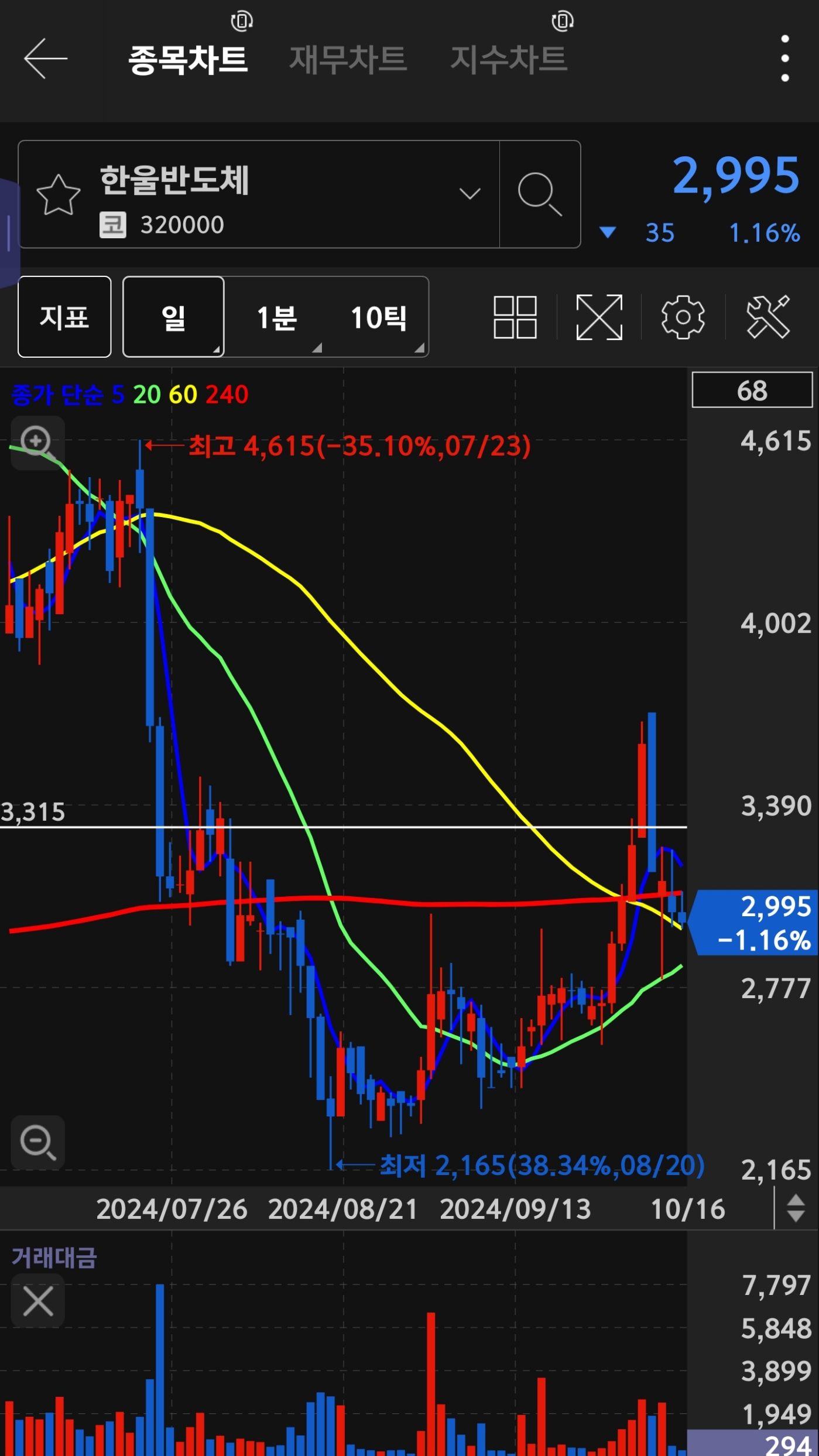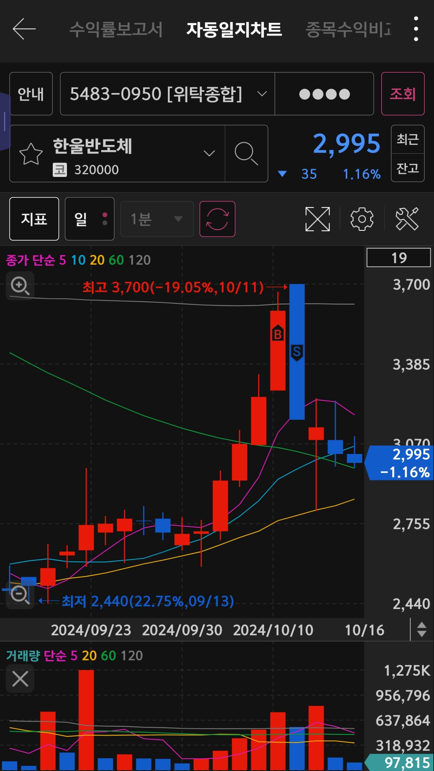 10월 10일 장기 이동평균선 돌파로와 거래대금이 많은 것으로 생각하여 구입했습니다!